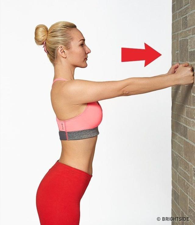 距離牆面半公尺,伸出雙臂,用力用拳頭頂住牆壁。壓20秒休息10秒,重複3次。