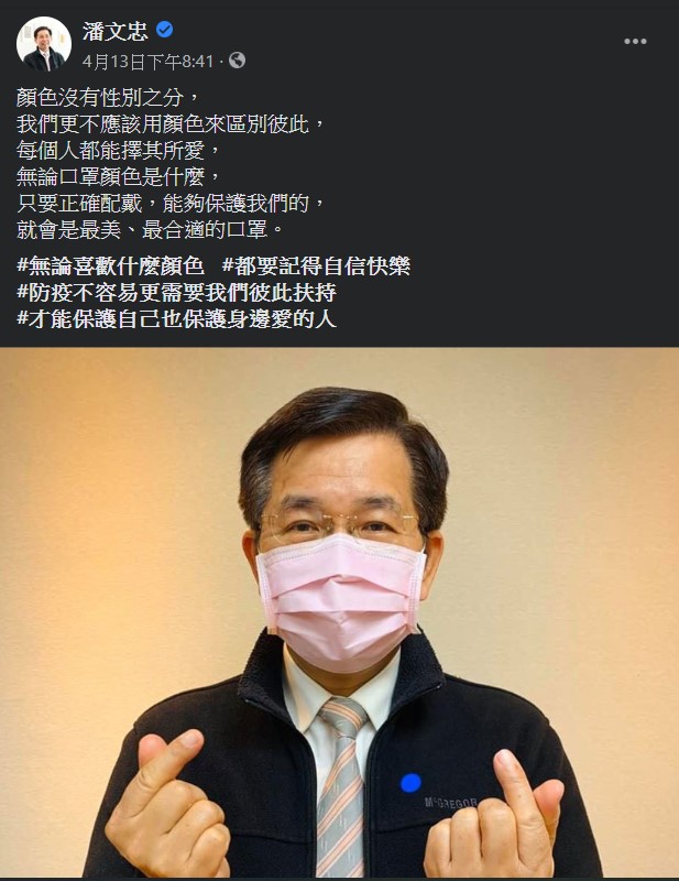 總指揮官陳時中針對這件事,發表了語重心長的一席話,當中提到「其實口罩的顏色都一樣,大家都可以戴,粉紅色其實也不錯,我們小時候最喜歡看的卡通影片就是粉紅豹,粉紅色在那個時候確實是很紅的一個顏色。」令不少網民紛紛留言表示支持。