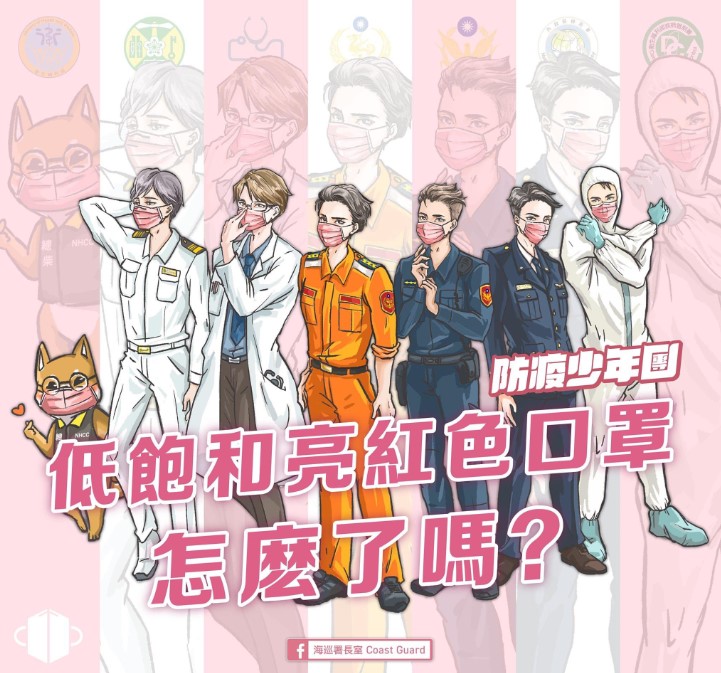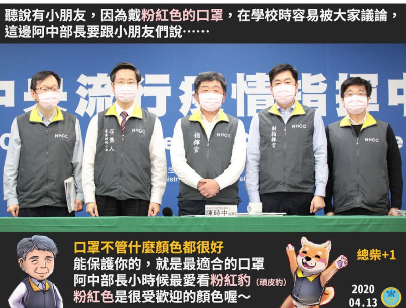 衛福部總柴換上粉紅裝,大喊「我粉紅我驕傲」,教育部還推出粉紅動漫,以愛(口罩)、勇氣(洗手乳)、希望(酒精)之名,推出粉紅防疫戰士,10小時吸引近10 萬人觀看。海巡署長室粉專則是po出粉紅色「防疫少年團」海報,俊男美女團員與總柴都戴上粉紅口罩,還被國外網友分享。