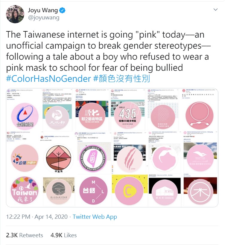 其後不少機構、品牌更把網上平台的Logo都換上粉紅色以示響應,甚至網絡上出現#pinkmask、#ColorHasNoGender #顏色沒有性別,至於台灣教育部長潘文忠亦強調「每個人都能擇其所愛,無論口罩顏色是甚麼,只要正確配戴,能夠保護我們的,就會是最美、最合適的口罩。」