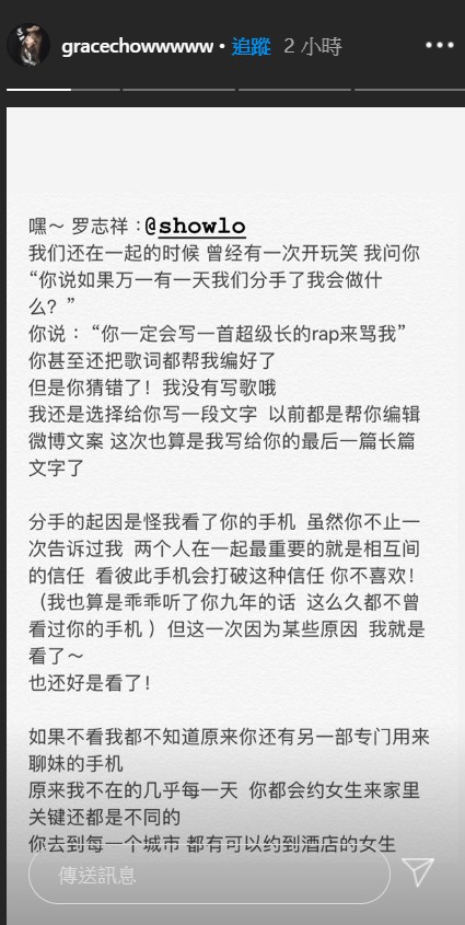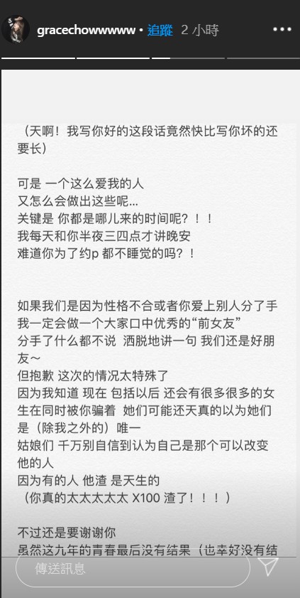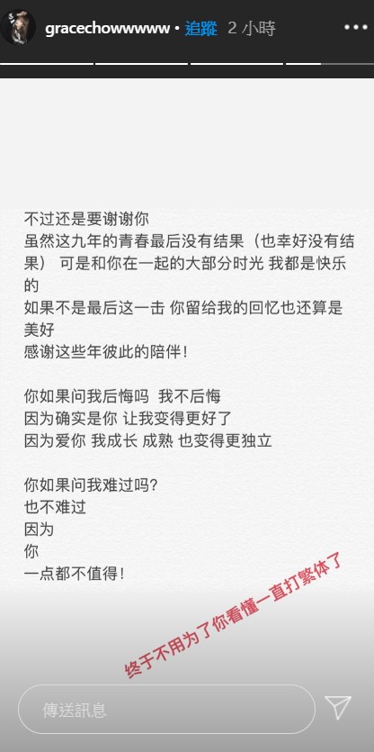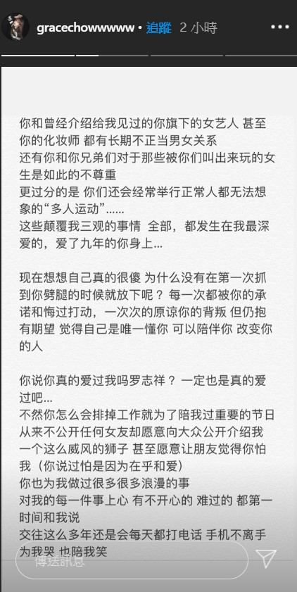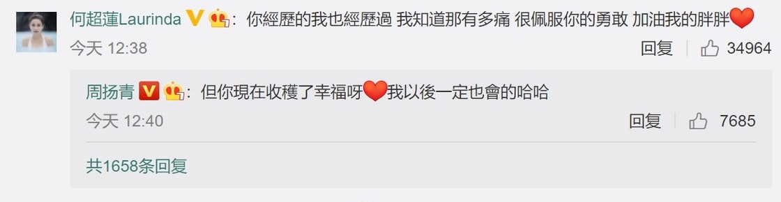 今早周揚青親自發文承認與小豬羅志祥已分手一段時間,同時踢爆男方在拍拖期間多次出軌、「多人運動」等四宗罪,繼羅志祥之後的回應後,賭王千金何超蓮在周揚青的發文下留言「你經歷的我也經歷過,我知道那有多痛,很佩服你的勇敢,加油我的胖胖」引來熱議!