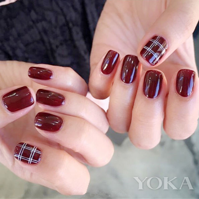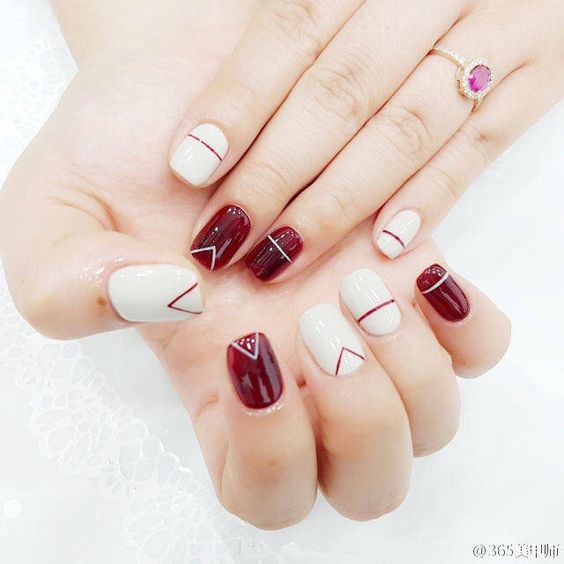 簡單的線條配上酒紅和白色甲油,簡約中帶點貴氣。
