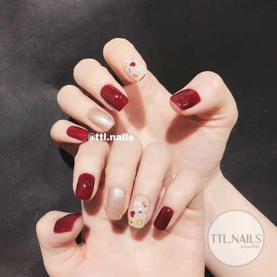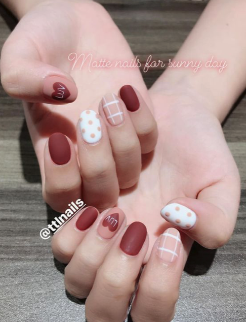 啞面酒紅色美甲效果超驚豔,加上波點和心形的圖案很夢幻。