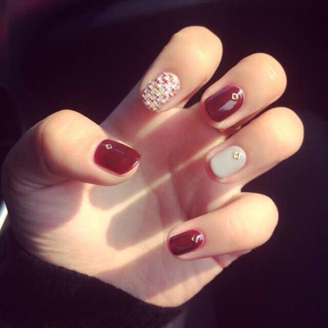 酒紅色的指甲上加上金色菱形小裝飾,配搭編織感和淺灰美甲,超高質感~