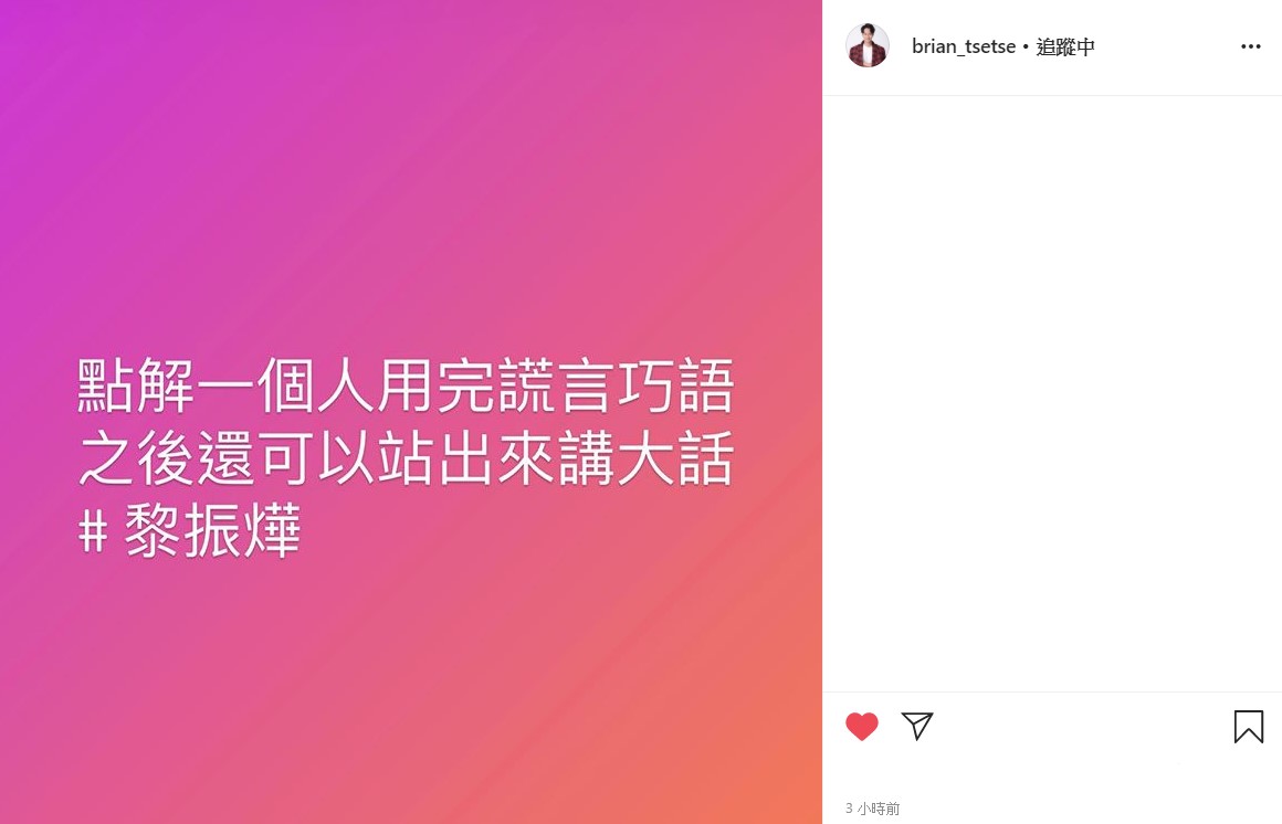 最近鬧得滿城風雨的「偷食蛋糕事件」,隨著朱智賢與「好朋友」謝東閔出席記者會並道歉後稍為降溫,正當外界都以為這場「蛋糕之亂」會慢慢被淡化,事件的另一主角黎振燁沉默多日後,昨日終於外出離開家門,陪同有8個月身孕的太太進行產檢,兩人更回答了在場記者的問題,當中黎振燁更交待了與朱智賢的「食蛋糕」內情,疑令「好朋友」謝東閔相當不滿,於深夜在Instagram上寫下「點解一個人用完謊言巧語之後還可以出來講大話#黎振燁」,開名炮轟!
