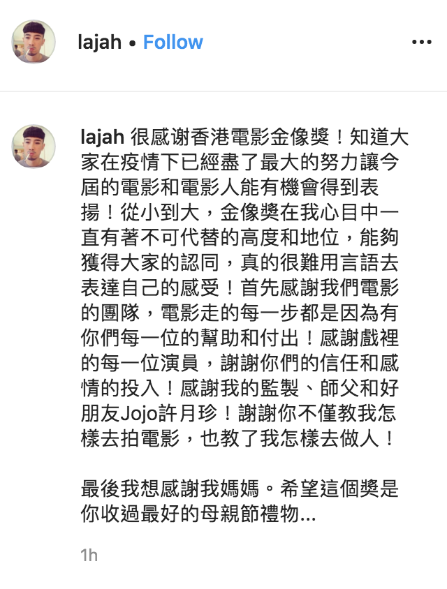 曾國祥在得獎後他在Instagram上分享自己的得獎感受,除了向台前幕後的電影工作者致謝外,他更特別和向母親致謝「希望這個奬是你收過最好的母親節禮物」他其後接受訪問時表示,因為疫情關係,自己選擇與爸媽一起看直播,當媽媽知道他得獎後更哭了出來,另外令曾國祥感動的是,當他與周冬雨聯絡時,對方說了一句讓他非常感觸良多的話「我們認識了這麼多年,你終於得獎了!」