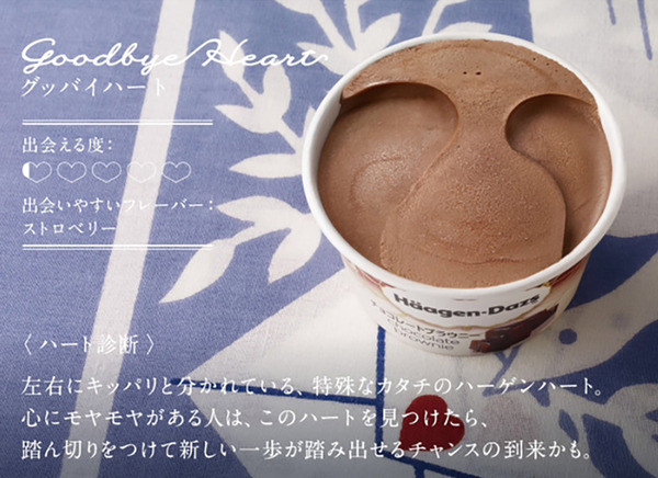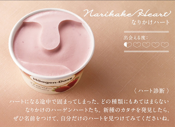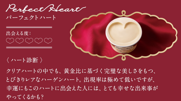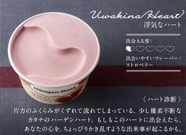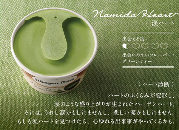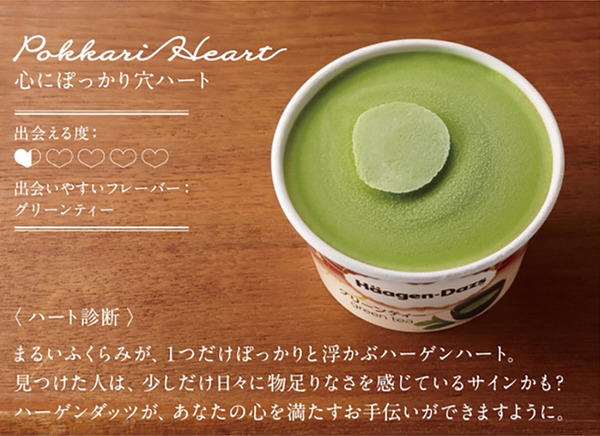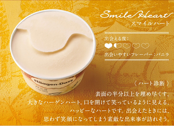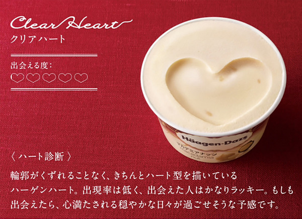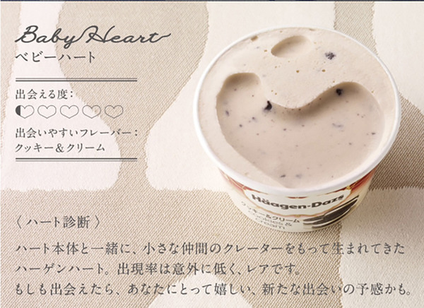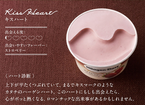大家平常吃杯裝雪糕時,有沒有注意到每次開蓋後,雪糕面總是出現不同形狀的凹凸洞?這些凹凸洞由空氣而成,看似無用,原來暗藏運勢小秘密!日本Häagen-Dazs特設一個「Haagen Heart Hunting」的網站,調查上千個的Häagen-Dazs迷你杯中雪糕因為空氣所產生的凹洞,並統計出各種心型凹洞的出現機率以及容易出現這種形狀凹洞的口味,同時為吃雪糕的你預測當天的運勢,趕快開一杯冰凍雪糕,看看你的戀愛運是如何啦!