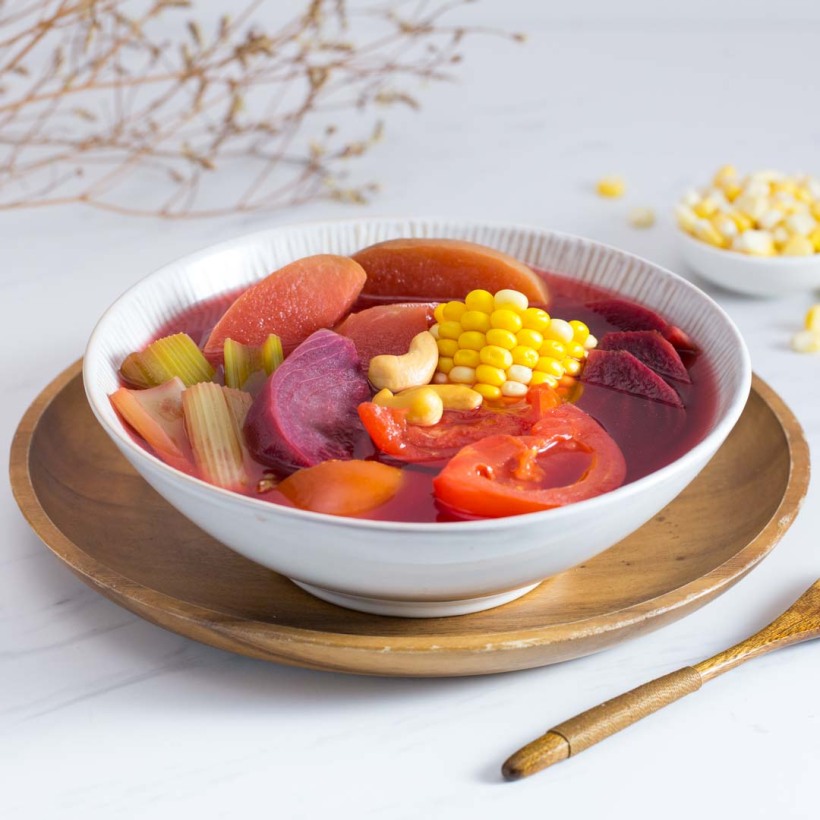 1.紅菜頭去皮,洗淨切塊;甘筍洗淨切塊;粟米去皮切件;西芹切段。