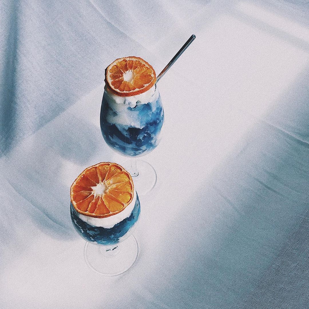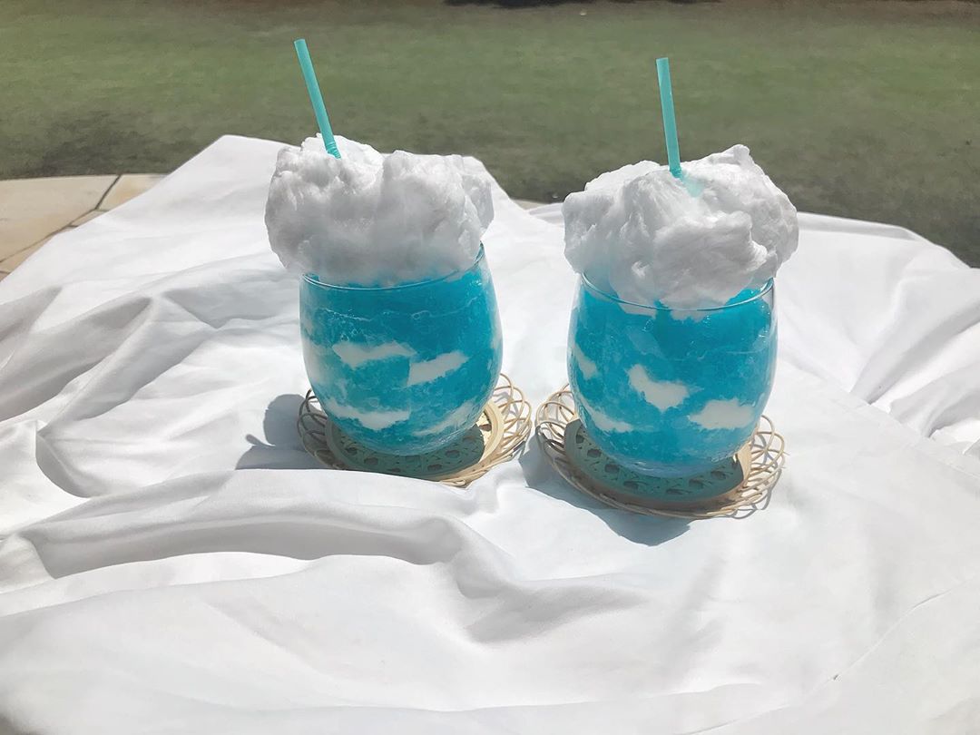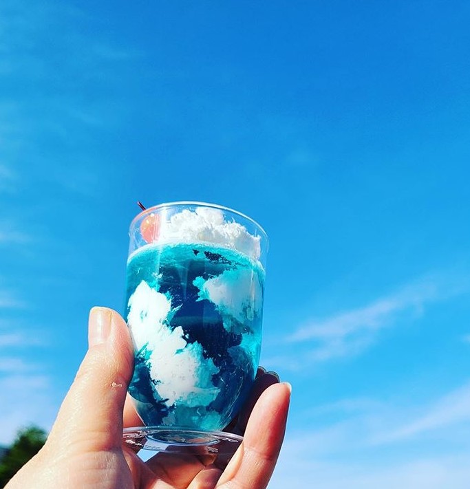 取出果凍倒入透明杯,此時便可以將選擇的白色食物與藍色果凍做交疊製作出藍天與雲朵的樣子。 最後在飲料最上方放上棉花糖便完成了。然後我們就能會看到美美的藍天白雲了!