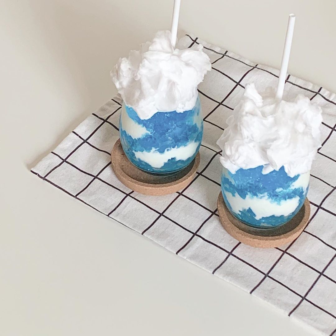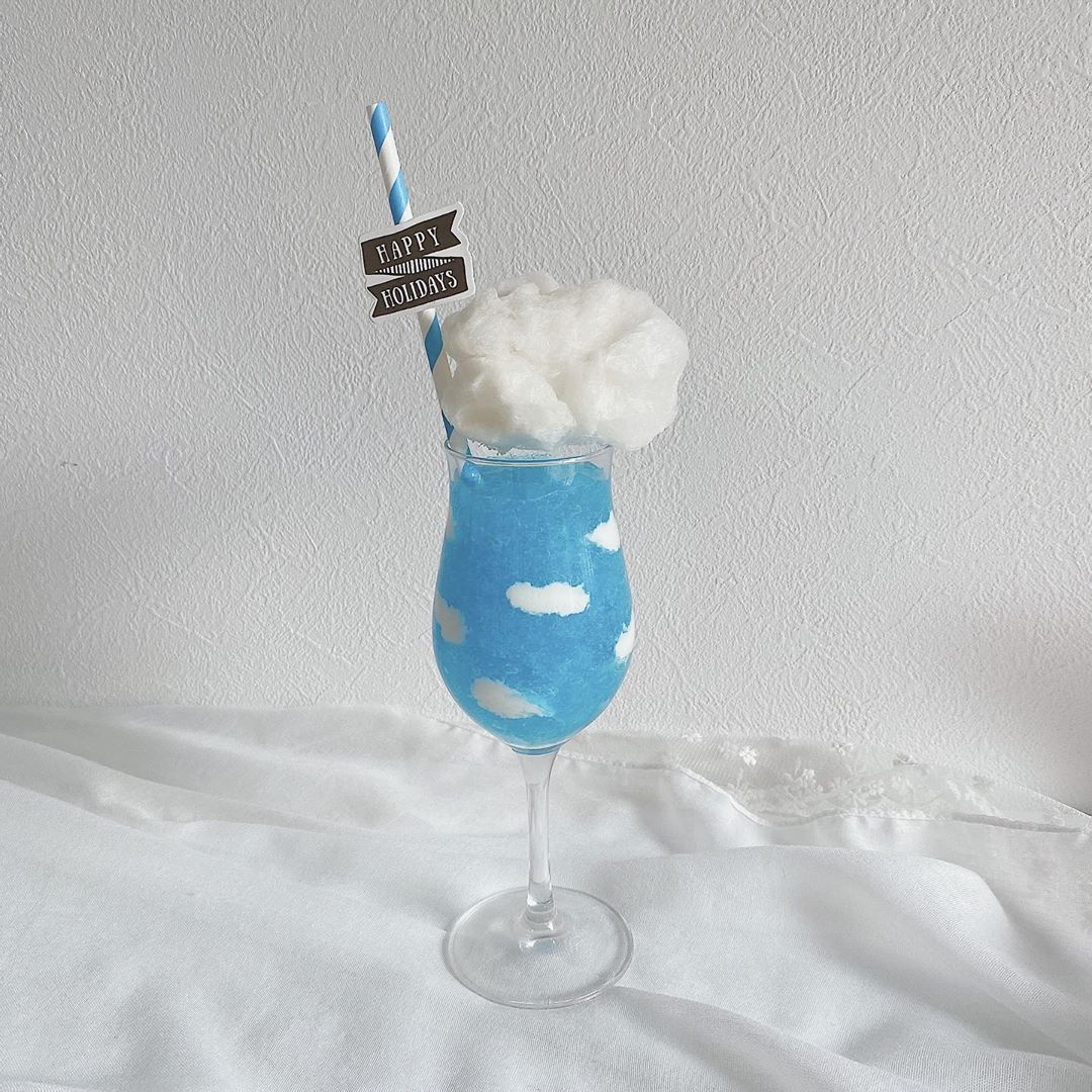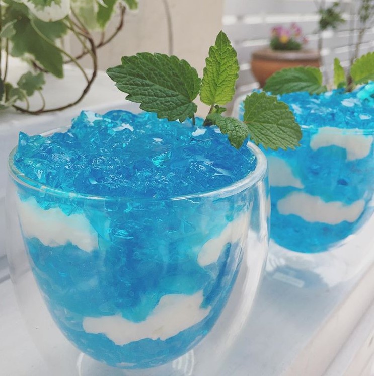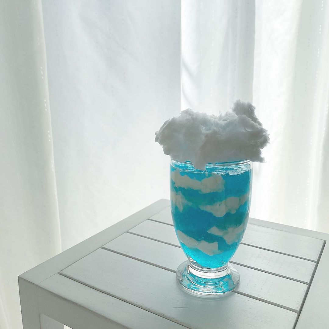 而製作方法也很簡單,藍天是由藍色夏威夷糖漿和無糖的碳酸飲品製作出來,藍色夏威夷糖漿在日本很常見,如果在香港找不到的話也可以用食用色素代替。先將魚膠粉融化於熱水中備用。之後將夏威夷糖漿融入無糖碳酸飲品或梳打水中,攪拌均勻後再稍微加熱40-50秒,然後把糖漿水跟融化的魚膠粉水混合,慢慢攪拌至均勻就可以,混合後再倒入杯內然後放到雪櫃等待凝固成果凍。