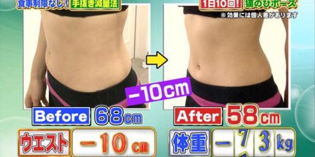 節目請到岡本麻里親身試驗,每天做這個動作之後,神奇的事發生了,她竟然從小腹婆變姚窕,腰圍從68公分減到58cm,整整減了10cm!!!體重也有非常明顯的改變,瘦了8磅!