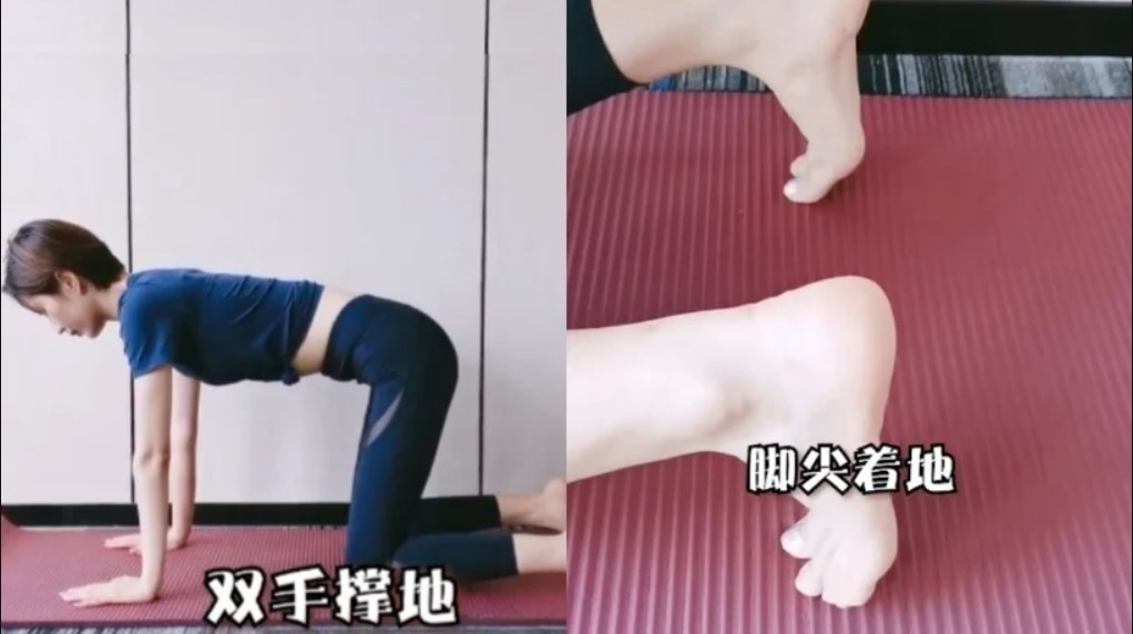 先以膝蓋跪地、雙手手掌撐地,並以腳尖著地。