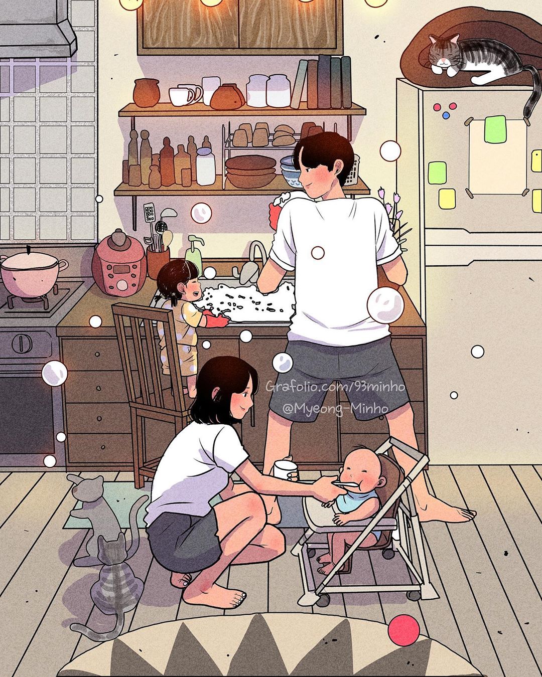 南韓高人氣插畫家 Myeong-Minho(명민호)IG上有54萬個追蹤者,從過去畫情侶間的甜蜜日常,到畫兩人步入婚姻、生下寶寶後的生活,不改的是,丈夫依舊將妻子捧在手心。知道妳辛苦的地方,要撐起一個家很難,但我有很多的愛。在 Myeong-Minho 的作品中我們看到,不管面臨多少的變化,我的伴侶,至始至終會是我最需要珍惜的那個。現在,就一起來看看寵妻達人的日常吧!