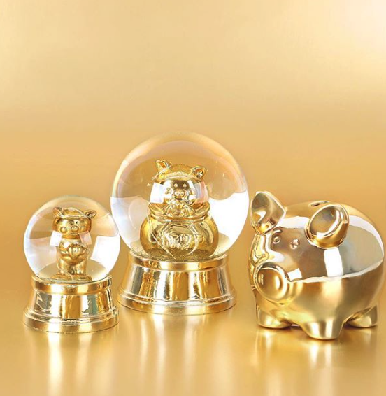 還有金光閃閃的擺設和豬仔儲錢箱,水間球搖一搖就會飄下金粉,非常應節又夢幻!