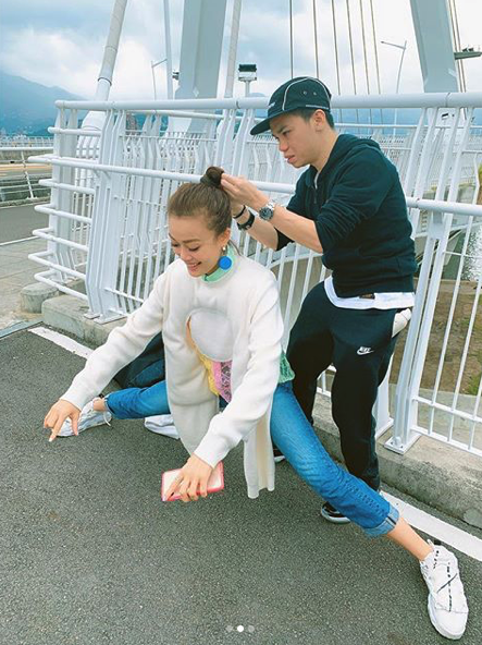 當日阿嬌以一身裸色Deep V婚紗靚爆出場,胸前綴有紫紅色繡花加上浪漫盤髮,好優雅好有仙氣;而老公賴弘國則以簡單無呔西裝上場~