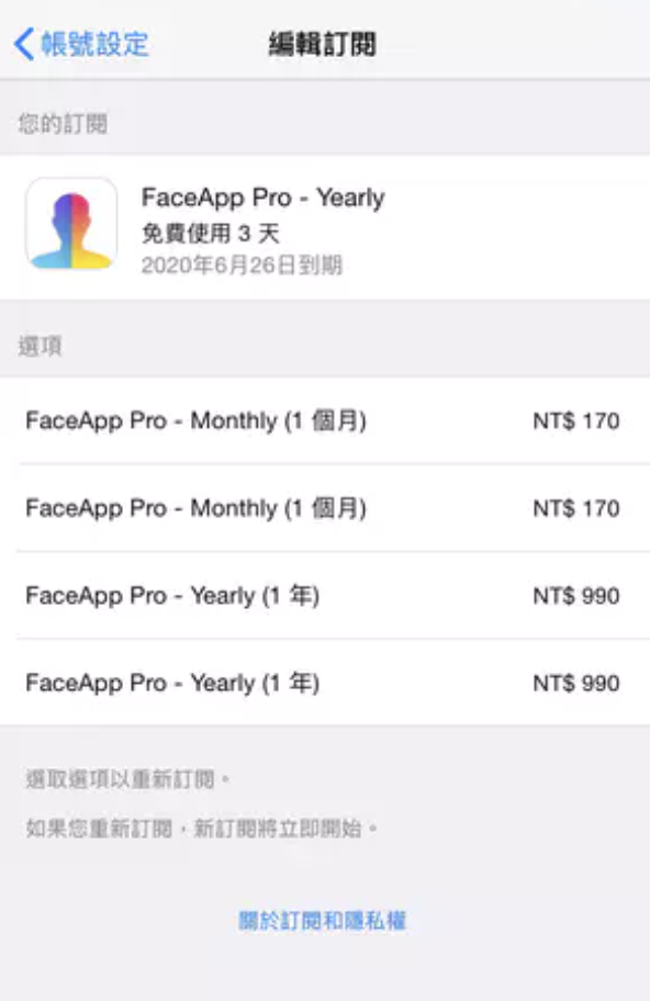 提醒大家,免費試用後記得要在 3 天內取消訂閱,刪除不代表取消訂閱,仍要進入手機設定中進一步取消才行。萬一不幸已被扣款,事後再向平台方申訴恐怕沒有用。以使用 Android手機來說,開啟 Google Play,點擊左上角進入選單再點擊【訂閱】,查看是否有 FaceApp 項目,並從【管理】→【取消訂閱】來設定。至於使用 iPhone 而言,則在App Store點擊右上角的個人圖像 →【訂閱項目】,確認是否有 FaceApp 項目,有的話立即取消訂閱。