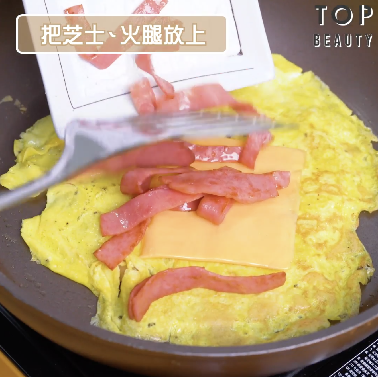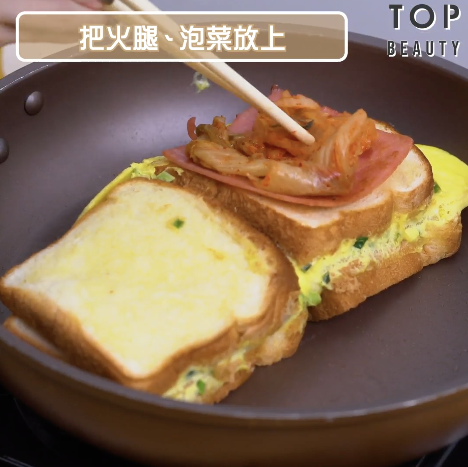 4.再鏟起一半反轉,然後把火腿、泡菜放上。