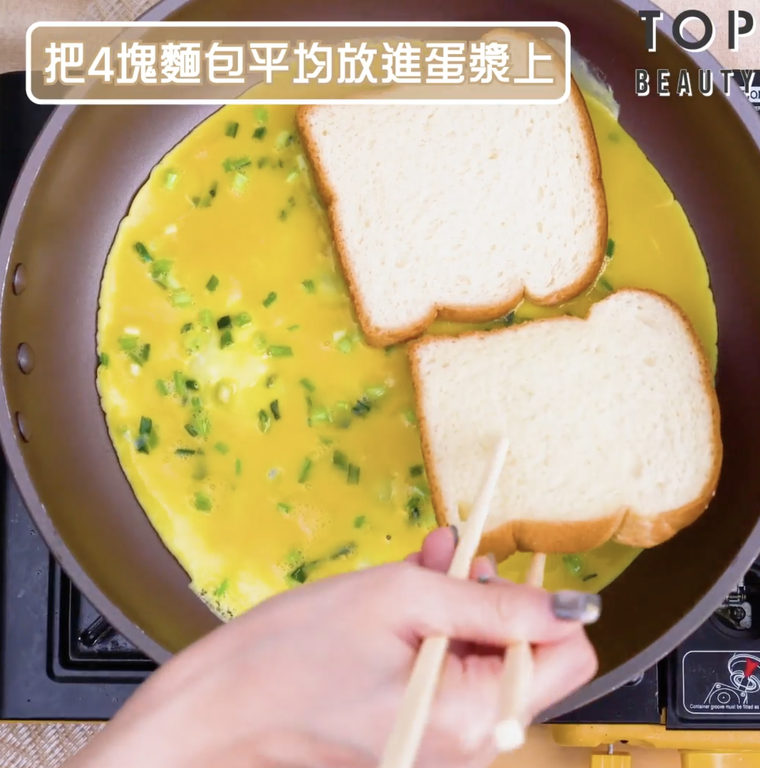 2.再把蛋漿倒進鑊中心,待成形後把4塊麵包平均放進蛋漿上。