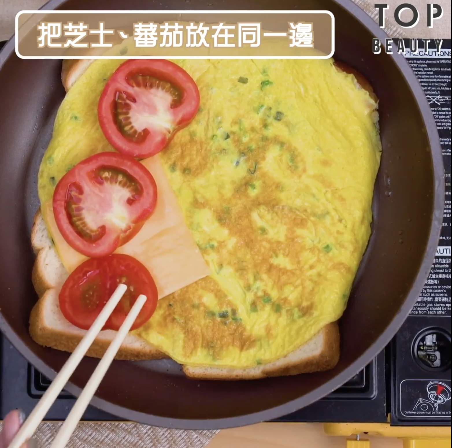 3.把已預先熱溶的牛油塗往麵包上,再鏟起一半反轉,然後把芝士、蕃茄放在同一邊。