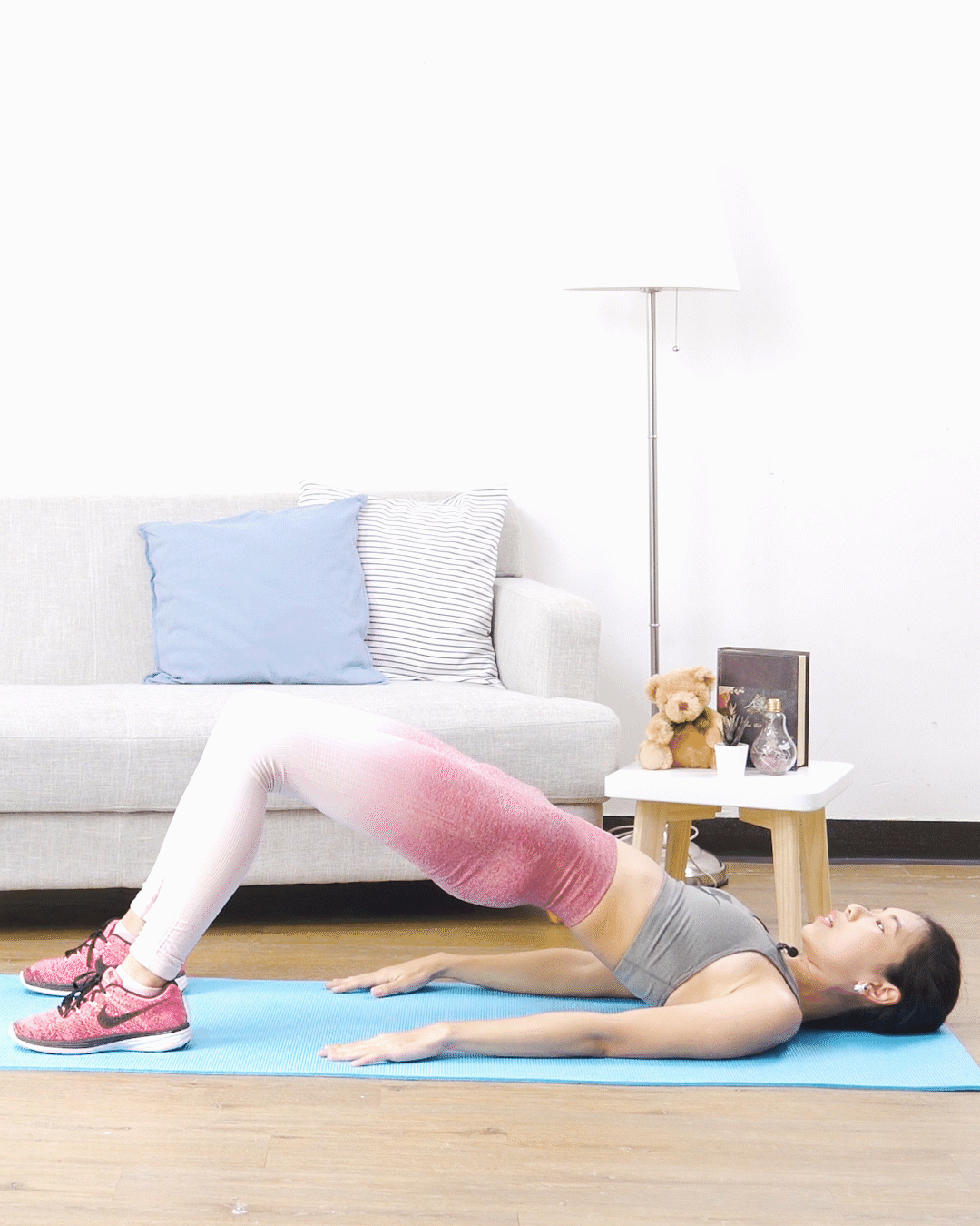 躺於地上,上半身要放鬆,然後腳跟用力向下踩,抬高臀部,記得核心肌肉要鎖實向下壓,然後伸直其中一隻腳,放低,再伸直另一隻腳,再放低,左右腳交替各做15下,要注意整個過程盆骨要穩定,不能夠左搖右擺!