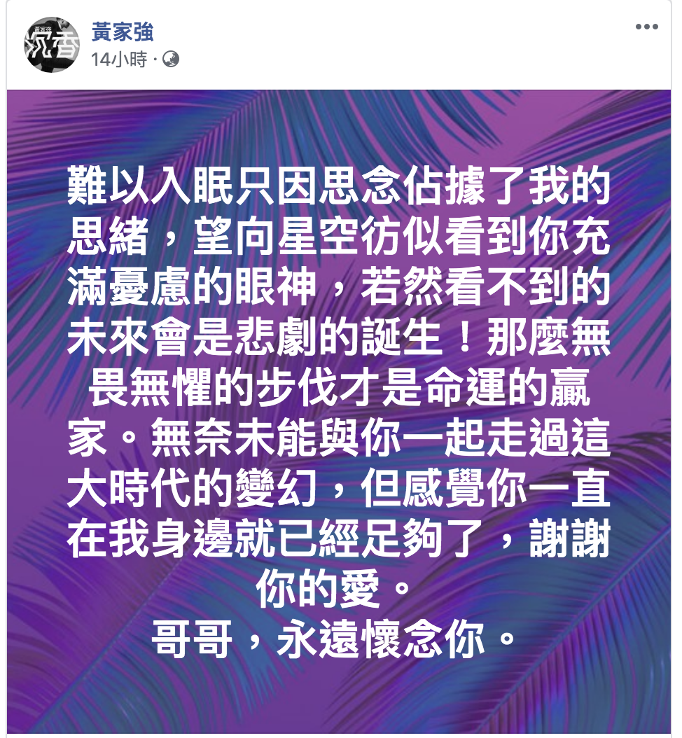 而弟弟黃家強也在Facebook上發文懷念哥哥,難以入眠的他表示「難以入眠只因思念佔據了我的思緒,望向星空彷似看到你充滿憂慮的眼神,若然看不到的未來會是悲劇的誕生!那麼無畏無懼的步伐才是命運的贏家。無奈未能與你一起走過這大時代的變幻,但感覺你一直在我身邊就已經足夠了,謝謝你的愛。哥哥,永遠懷念你。」