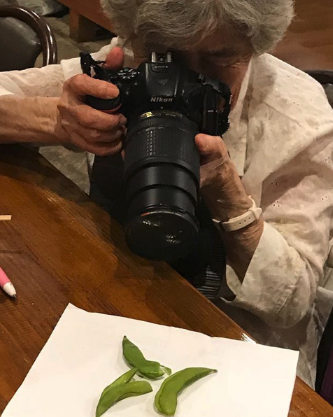 西本喜美子手拎大大部單反,雖然只係幾條豆,婆婆都要「相機食先」!