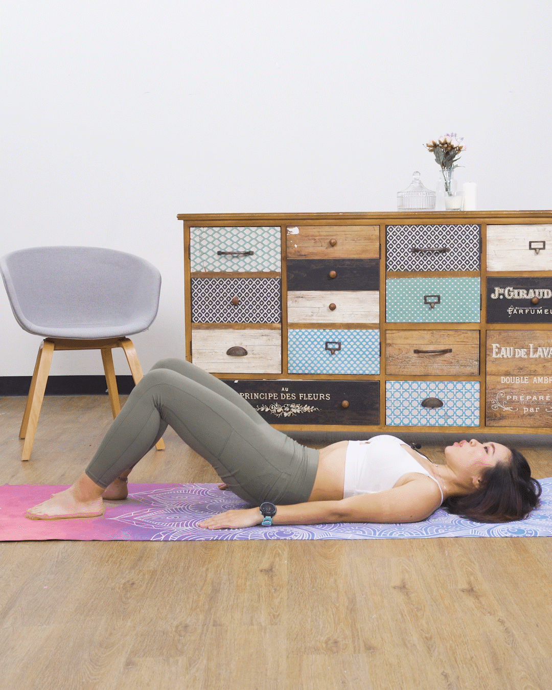 先躺於地上,腳跟要與膝蓋垂直,雙腳打開盆骨闊度,膝蓋指向天,僅記肚臍內收,腰椎貼着地面,支撐自己的腰部,肩膊放鬆,雙手放盆骨旁,慢慢由盆骨捲起,腰椎背部慢慢離開地面,直至膝蓋腹部肩膊呈一直線,然後慢慢由背部腰椎臀部放下來,做6-8下。
