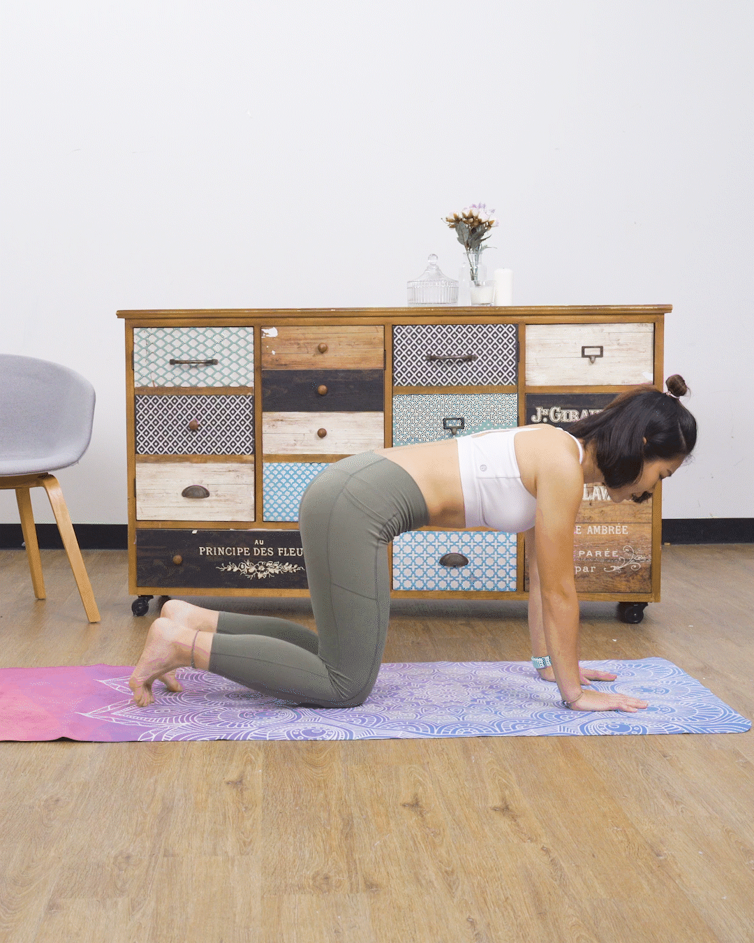轉為跪姿,雙手跟膊頭垂直,膝蓋跟盆骨垂直,將肚臍內收,背部要保持一條直線,將其中一隻腳伸出來,慢慢升高離開地面,直至盆骨高度,再慢慢下來,碰一碰地面再抬高,這個動作可以訓練我們的臀部和大腿,左右交換做,每邊各做做6-8下。