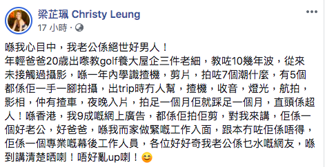 原來一直以來的《潮什麼》系列都是她丈夫有參與的,而老公本身任職高爾夫球教練,工作時間較靈活,不時會陪她拍攝,結果邊學邊做成為這個系列的導演與攝影師。「年輕爸爸20歲出嚟教golf養大屋企三件老細,教咗10幾年波,從來未接觸過攝影,喺一年內學識揸機,剪片,拍咗7個潮什麼,有5個都係佢一手一腳拍攝,出trip時冇人幫,揸機,收音,燈光,航拍,影相,仲有揸車,夜晚入片,拍足一個月佢就踩足一個月,直頭係超人!」更表示在自己現在的工作入面,根本就不能沒有他!
