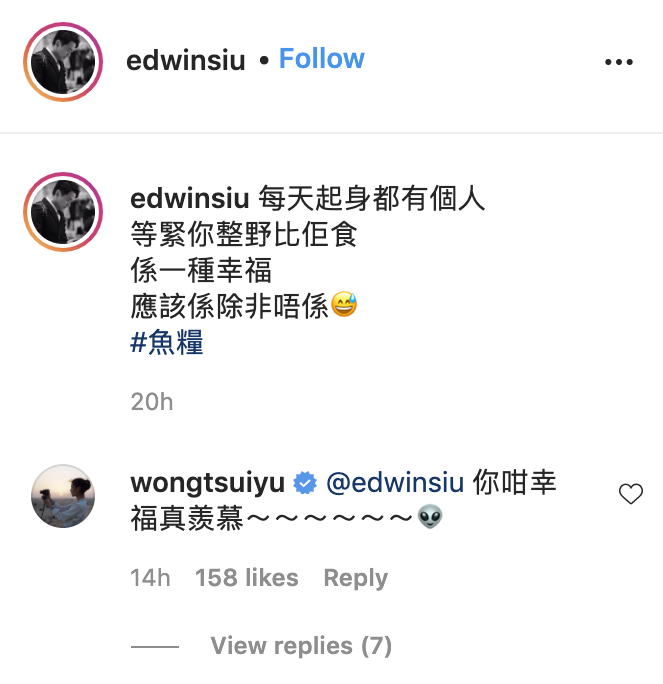 不過,大家的焦點並非蕭正楠炮製的美食,而是他的髮型,其中胡鴻鈞留言「起身個頭就已經好似set左咁」,蕭正楠回覆「臨瞓前set嘅」,亦有網民說他「頭髮亂亂」、「你個頭生意失敗Look」等,更有人搞笑留言「你係咪曲線投訴緊 雖然你應該唔夠膽」!黃翠如與蕭正楠相戀已有6年多,感情始終如一,不管是在鏡頭前還是私底下,都毫不保留地展現對彼此的愛意,是每個人都嚮往的愛情,現在就一起看看他們的愛情保鮮方法啦!
