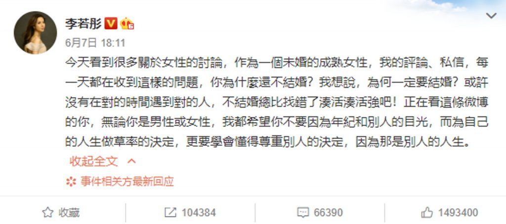 李若彤寫道:「今天看到很多關於女性的討論,作為一個未婚的成熟女性,我的評論、私信,每一天都在收到這樣的問題,你為甚麼還不結婚?我想說,為何一定要結婚?或許沒有在對的時間遇到對的人,不結婚總比找錯了湊活湊活強吧!正在看這條微博的你,無論你是男性或女性,我都希望你不要因為年紀和別人的目光,而為自己的人生做草率的決定,更要學會懂得尊重別人的決定,因為那是別人的人生。」