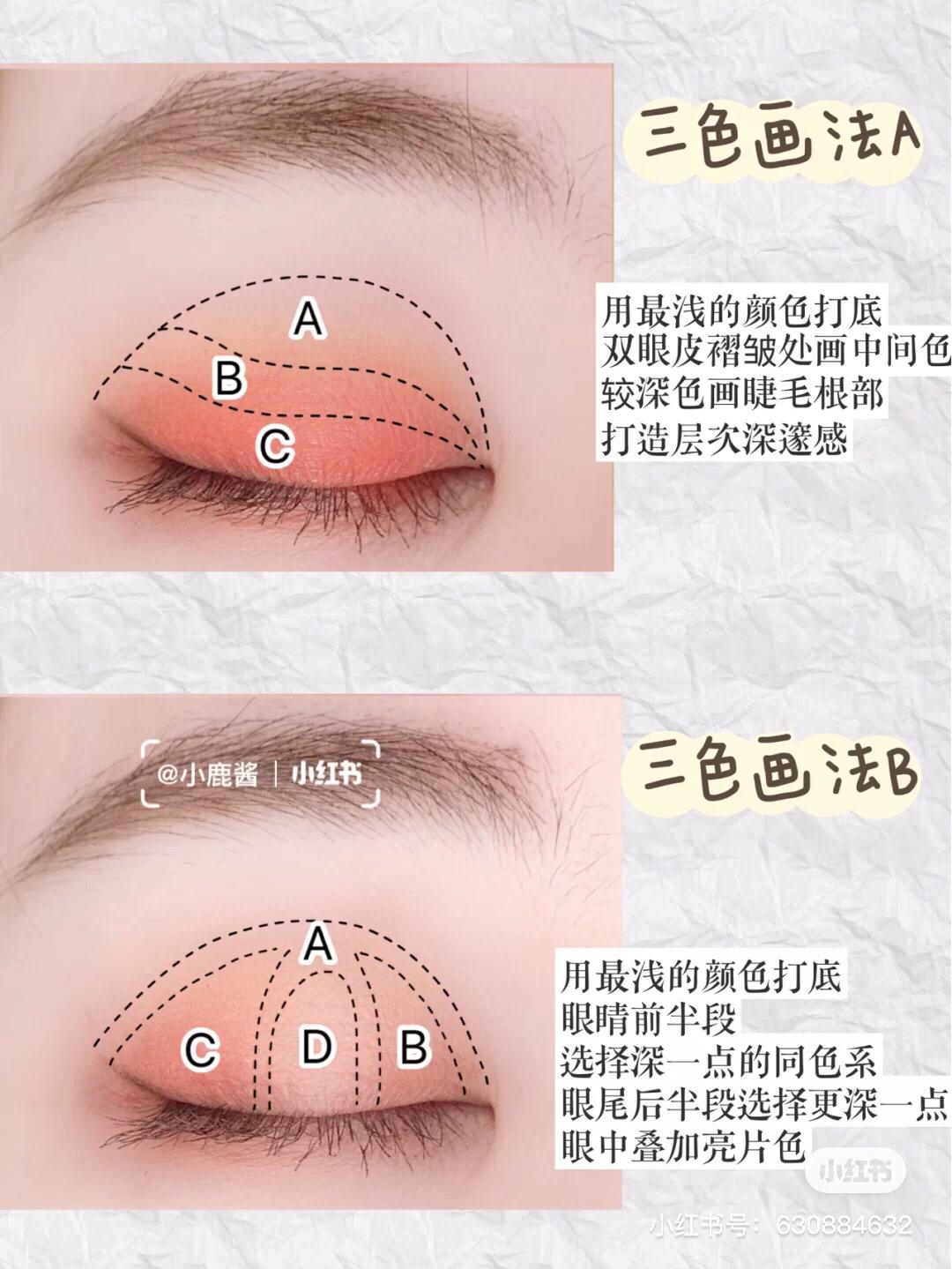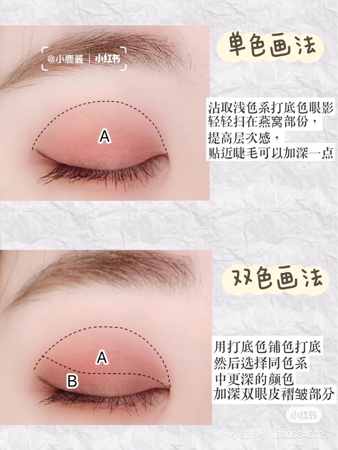 用最淺的眼影顏色打底,然後將眼窩分為前中後3部份。前半段就用深少許的同色系眼影,後半段就選擇再深色的眼影,中間位置就加入提亮色,橫向暈染,即可。