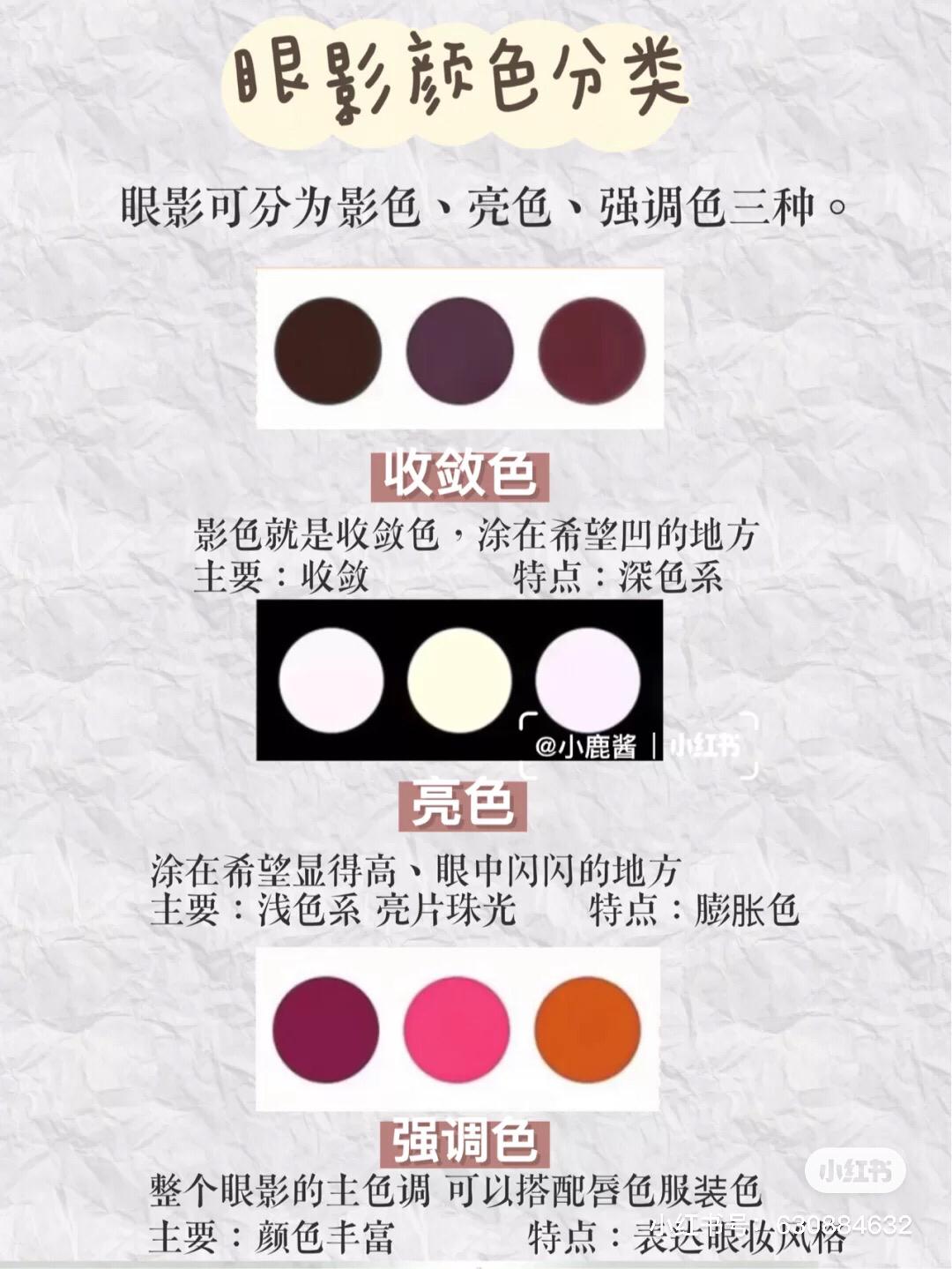 學習畫眼影之前,大家可以先簡單了解一下眼影顏色的分類,讓你更易掌握眼影色盤的應用。眼影大致會分為影色、亮色,以強調色3種。影色就即是收斂色,塗在想營造凹的位置,為深色系; 亮色就是希望顯高,閃亮的效果,主要是淺色系或帶珠光; 而強調色就是眼影的主要顏色,用來表達眼妝風格,可搭配唇色、衣著,甚至場合。
