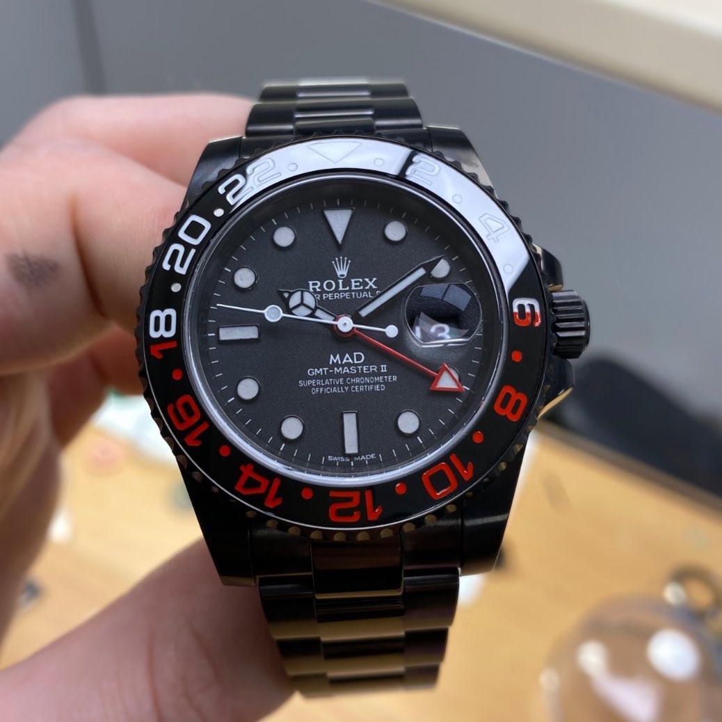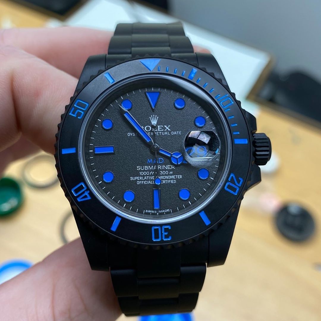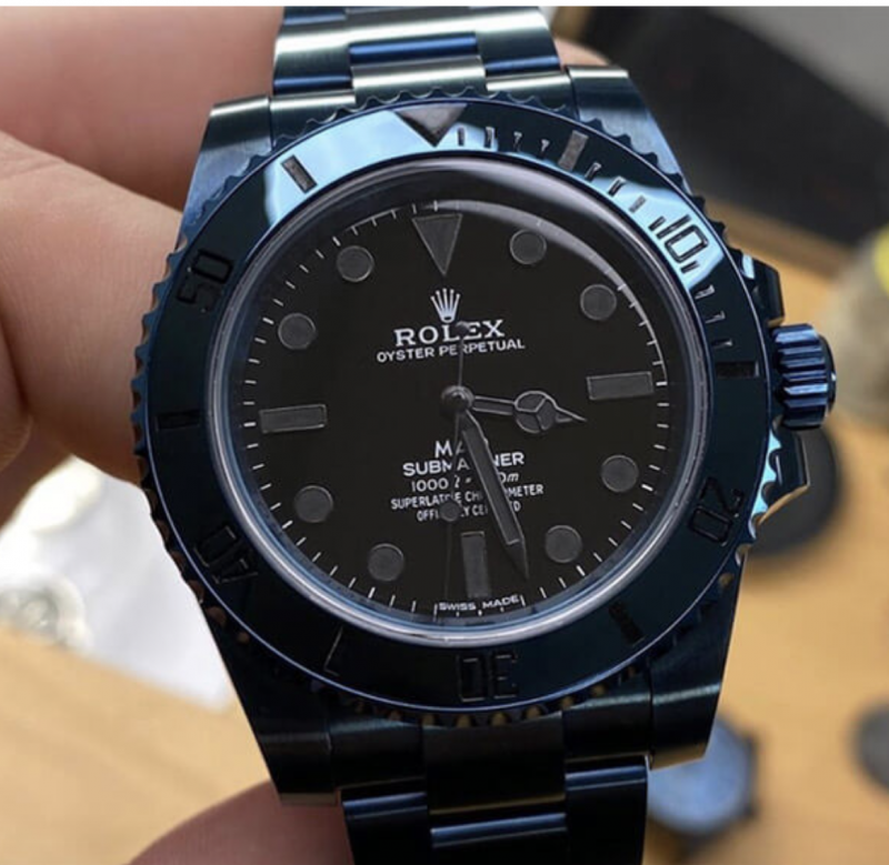 Submariner Date為勞力士最出名的款式,防水可達300米,對於一般日常佩戴而言已是相當高的規格!這款就算它的錶殼和鍊帶重新鍍上亮面黑的鍍層,倒三角標示、刻度以及指針也同樣鍍上全黑,雖然「All Black」,但卻以磨砂、亮面等的黑色質感來增添層次感!