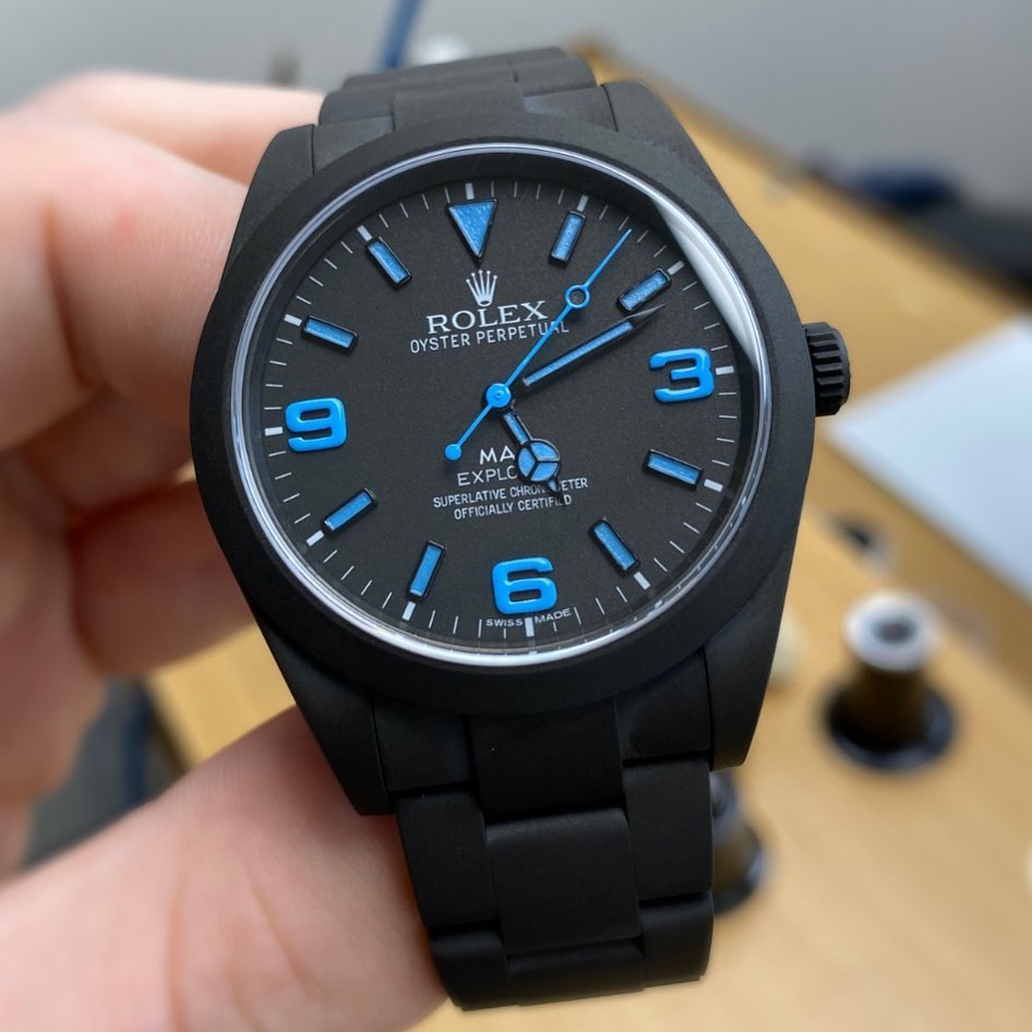 Rolex的Oyster Perpetual蠔式系列當中的Explorer偏向於專業型手錶,標榜堅固穩定、能夠適應任何極端環境,這款以磨砂黑配藍色的設計,體現出Explorer的簡單卻堅毅的感覺!