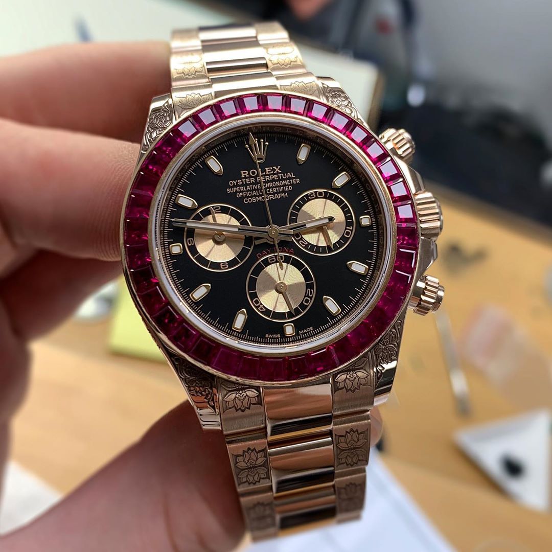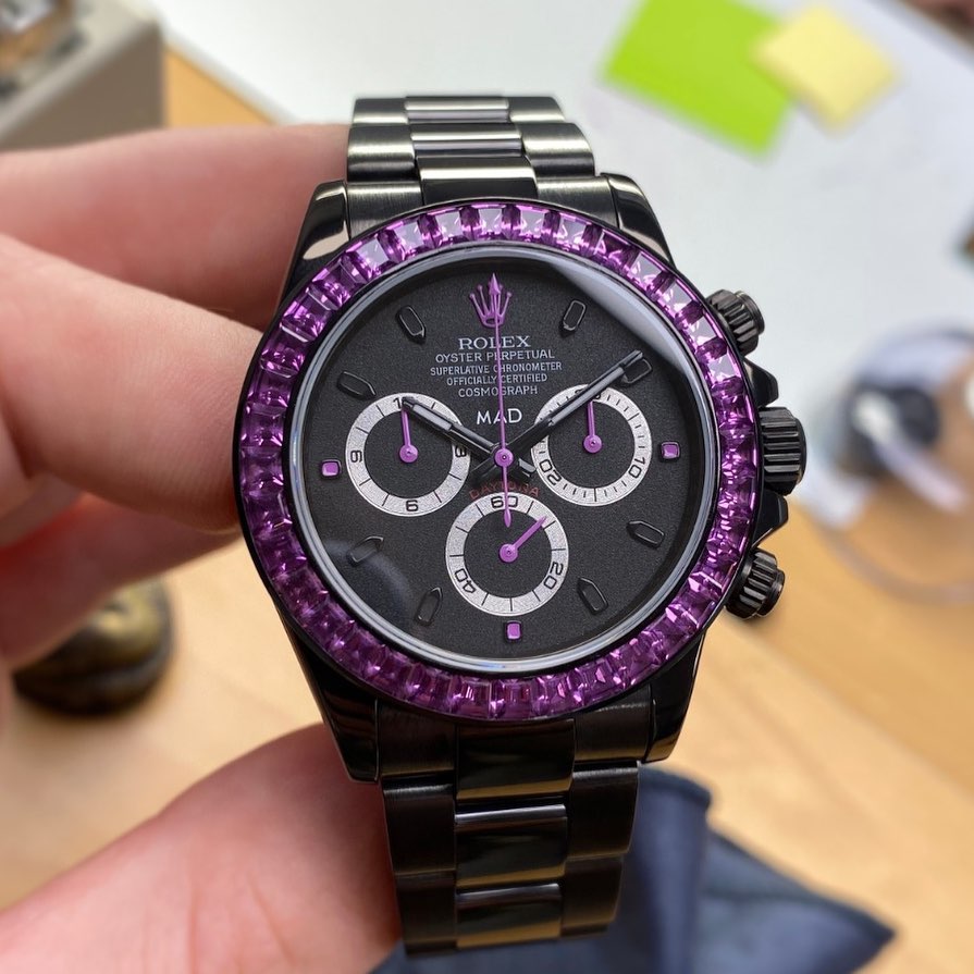 Daytona是Rolex另一款超人氣的暢銷系列,它配備Rolex相對少數的複雜功能(計時碼錶),堪稱是品牌歷史最悠久的複雜功能手錶!這款講求速度的賽車錶自1963年面世至今,錶款也產生出大大小小的調整與變化,還記得2018年發表的Daytona 116595RBOW嗎?它的彩虹圈讓不少「勞迷」深深著迷!而MAD Paris這一款雖只以紫色為主,但黑配上紫卻有種神秘又型格的魅力!