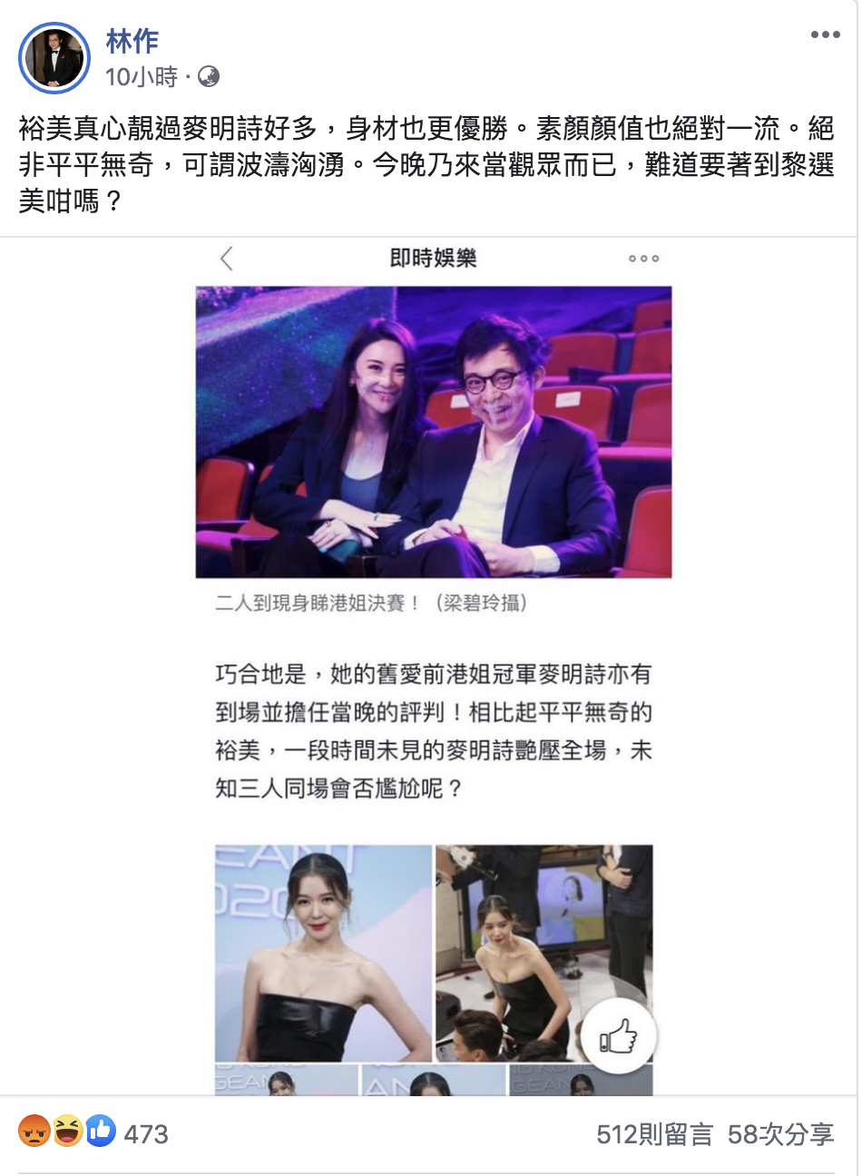另一個焦點則落在林作身上,皆因自公開與裕美的戀情後,昨晚香港小姐決賽就是他與新歡舊愛同場之地,他與現任女友裕美一同出席決賽;而麥明詩雖已告別TVB,但仍以一襲低胸黑裙出席並擔任今屆評判,而當決賽順利完結後,林作在凌晨兩點左右,就在社交平台上轉載了一篇媒體報道並發文表示「裕美真心靚過麥明詩好多,身材也更優勝。素顏顏值也絕對一流。絕非平平無奇,可謂波濤洶湧。今晚乃來當觀眾而已,難道要著到黎選美咁嗎?」引來一眾網民議論!