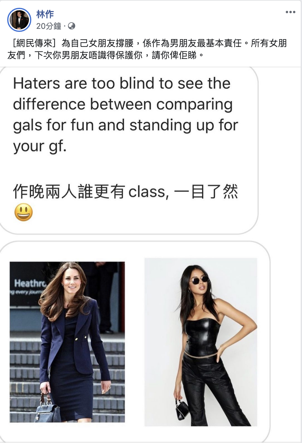網民的留言兩極,有人認為這是他「表達自己欣賞裕美的原因及清楚表明麥小姐不是他杯茶」;但也有大批網民主張「分手不出惡言」,認為就算只是自己的個人感受也不必公開比較前度和現任,這是基本的尊重!而今天中午林作又再一次發文講述自己發文的原因是基於「為自己女朋友撐腰,係作為男朋友最基本責任。所有女朋友們,下次你男朋友唔識得保護你,請你俾佢睇。」但依然有網民表示「保護女朋友係應該,但係尊重女性亦好重要」、「撐現任女朋友唔代表要踩低前度。」更有不少網民勸他不應因為一則第三方的報道而公開批評前度~