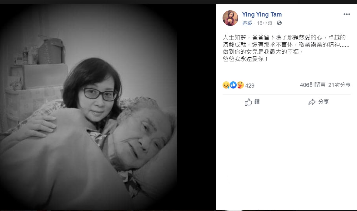 縱橫演藝圈近70年的炳哥,不論唱歌、演戲、電視、配音、主持都有涉獵,可以說是五棲的資深藝人,女兒譚淑瑩昨晚也在Facebook上分享一張與爸爸的合照,照片中的炳哥雖然在在病床上,卻依然帶著微笑對抗癌症!除了個人的演藝發展外,每當提起譚炳文的名字,總會令許多人把他與李香琴聯想起來,因為二人從70年代便開始合作,外界也一直把兩人當成是幕前情侶,但由於炳哥本身是有家室的人,所以讓這段感情關係在外界眼中疑幻疑真。