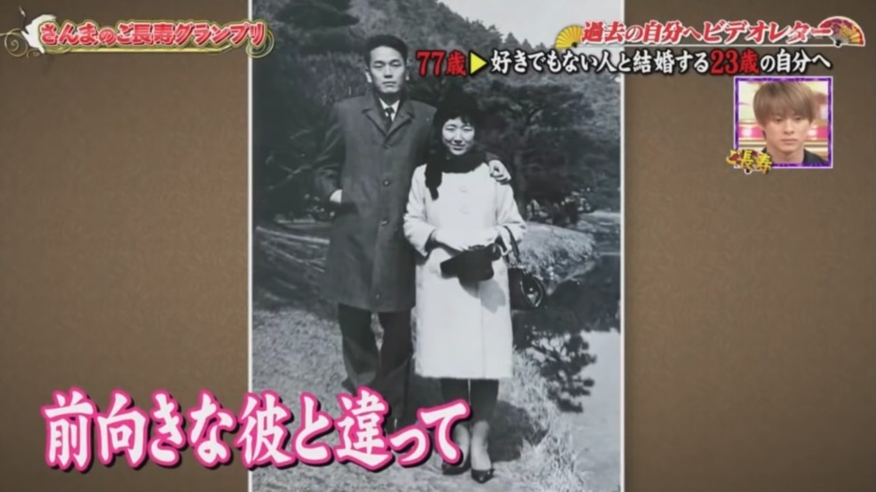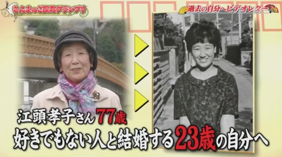 呢位來自日本佐賀縣,叫江頭孝子嘅老婆婆今次被邀請到節目《ご長寿グランプリ》上做嘉賓,一開始佢就充滿活力咁講:「23歲的孝子小姐啊!我是77歲的你啊!這頭雙方父母同意的婚事,新郎他是很積極,然而你對此卻不太有感覺」節目呢個時候就彈出一張黑白照,相片入面嘅情侶郎才女貌,非常般配!