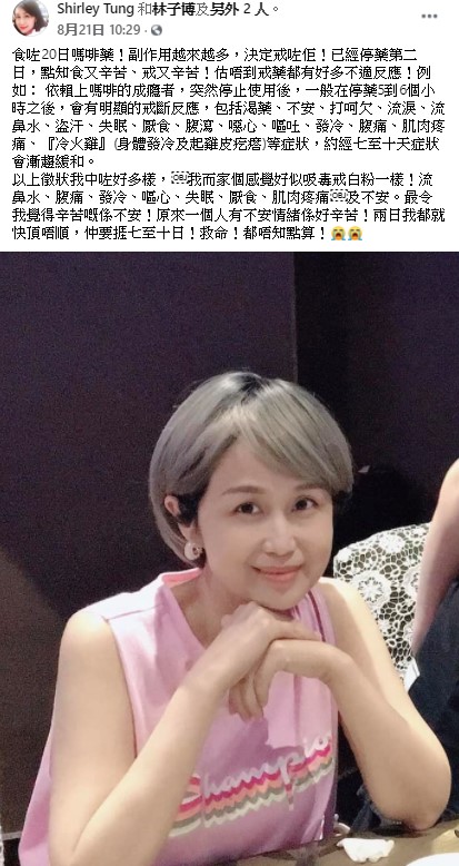 Shirley在facebook透露食嗎啡藥20日,由於有太多副作用,決定嘗試停藥。不過停藥兩天就像成癮者戒毒一樣辛苦,她說:「食咗20日嗎啡藥!副作用越來越多,決定戒咗佢!已經停藥第二日,點知食又辛苦、戒又辛苦!流鼻水、腹痛、發冷、嘔心、失眠、厭食、肌肉疼痛及不安。最令我覺得辛苦嘅係不安!原來一個人有不安情緒係好辛苦!兩日我都就快頂唔順,仲要捱七至十日!救命!都唔知點算!??」