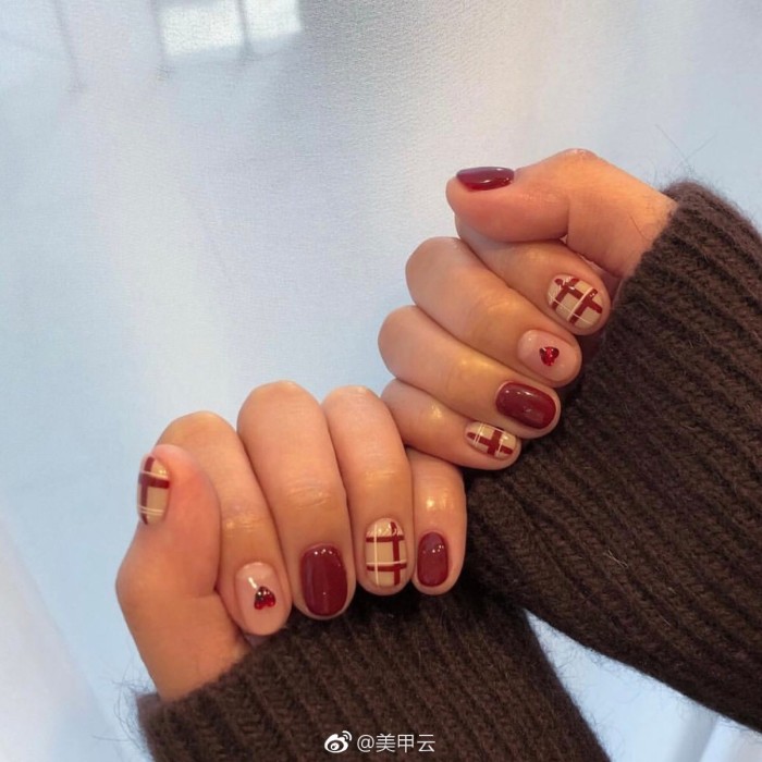 如果工作性質許可的話,大可以試試呢種活潑感更強嘅「紅調半透明甲」有別於普通嘅奶白色法式甲,以酒紅調同閃片作跳色,超吸睛!用嚟做新年美甲就最好不過啦!