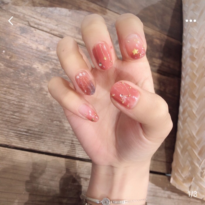 珊瑚粉妝容唔係人人識合,但瑚粉妝系美甲確實係減齡之選!超顯白又溫柔,再配上漸變元素同金色亮片(星星超可愛呢!)可愛系女生一定要試試!
