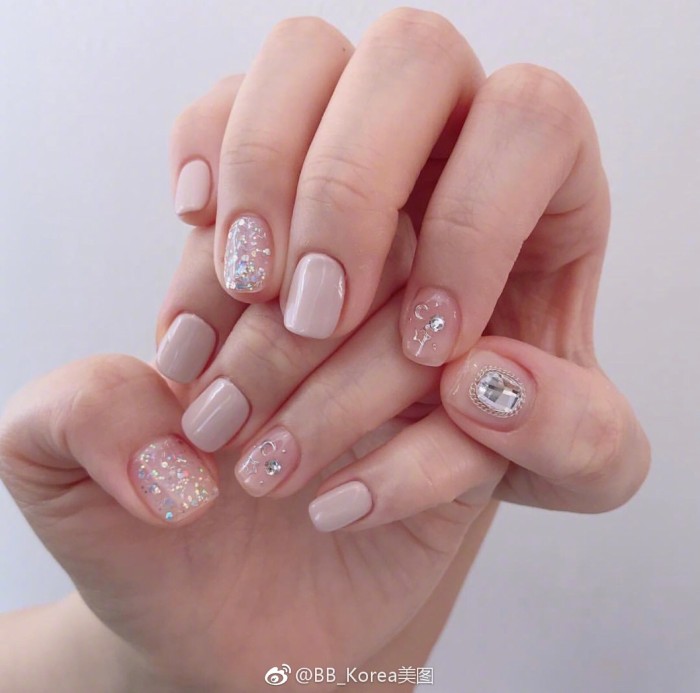想予人感覺再成熟、優雅一啲,大可以試試裸色美甲,略兼裸色過於單調嘅話,可以配以亮片作跳色,簡約款式適合上班一族之餘,萬能裸色根本就係華麗簡約於一身嘅配色吧~