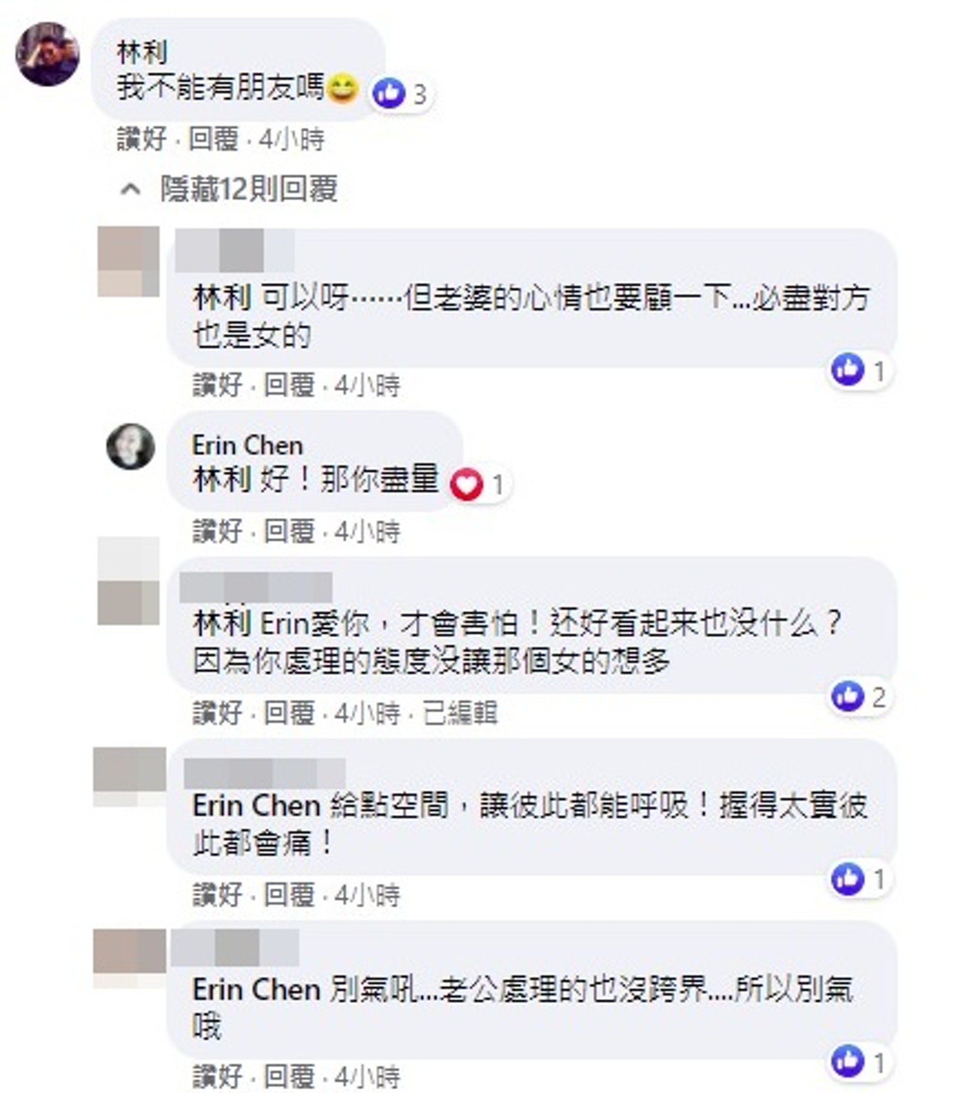 有網友留言:「看起來好像沒甚麼事啊?」Erin則回覆:「難不成在床上抓到才算數嗎?」雖然太太怒髮衝冠公開指罵陳柏渝,但林利卻沒有因此而有所忍讓,反而在太太的長文下留言:「我不能有朋友嗎」,太太隨後就留言反擊:「好!那你盡量」。大戰隨即一觸即發,期間不少網友都有留言勸交。