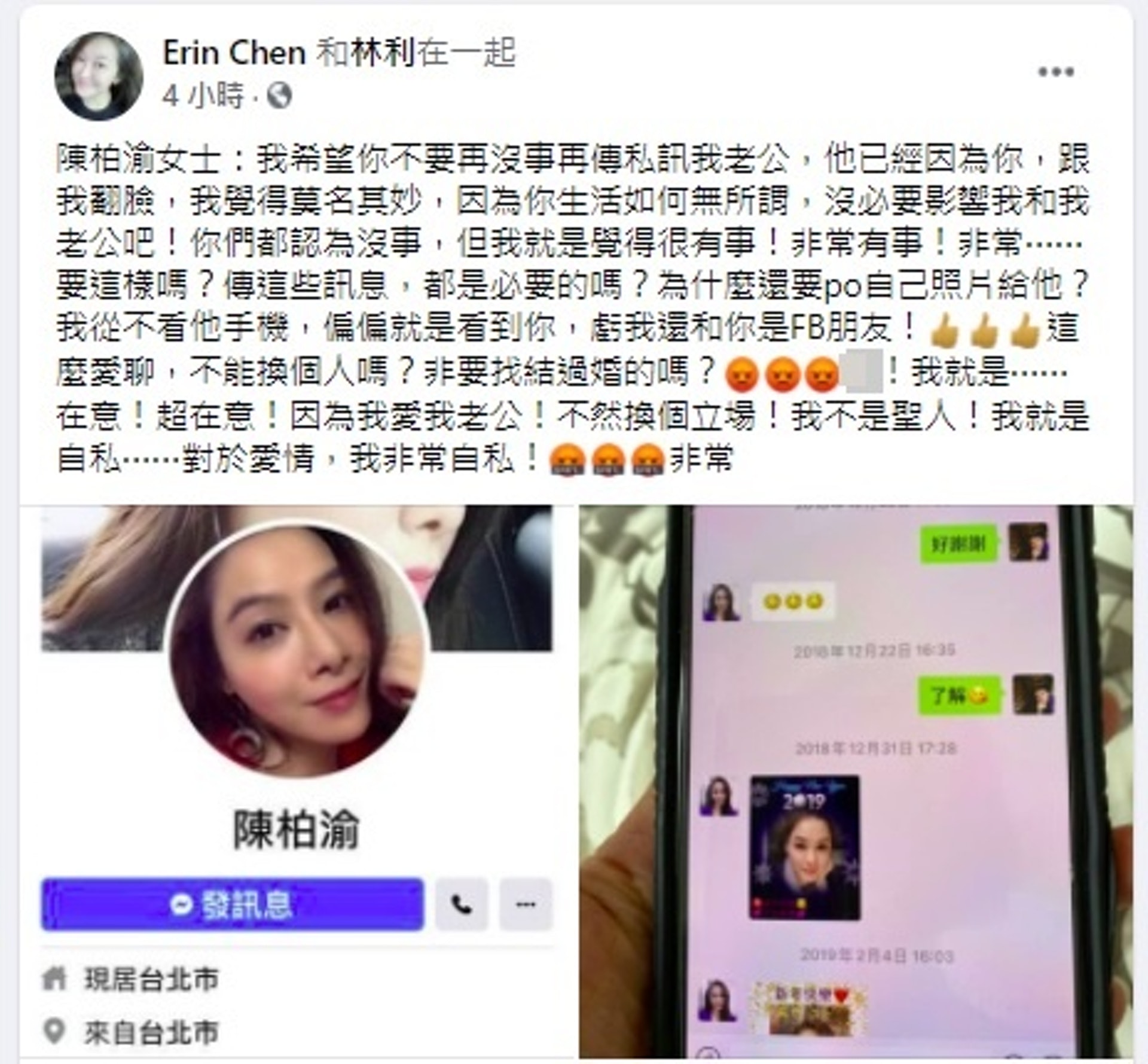 「陳柏渝女士:我希望你不要再沒事再傳私訊我老公,他已經因為你,跟我翻臉,我覺得莫名其妙,因為你生活如何無所謂,沒必要影響我和我老公吧!你們都認為沒事,但我就是覺得很有事!非常有事!非常⋯⋯要這樣嗎?傳這些訊息,都是必要的嗎?為什麼還要po自己照片給他?我從不看他手機,偏偏就是看到你,虧我還和你是FB朋友!這麼愛聊,不能換個人嗎?非要找結過婚的嗎?X!我就是⋯⋯在意!超在意!因為我愛我老公!不然換個立場!我不是聖人!我就是自私⋯⋯對於愛情,我非常自私!非常。」