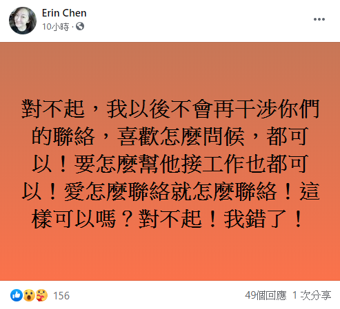 事件發生差不多一日,Erin已刪除昨日的帖文,而她凌晨再度發文,向林利道歉:「對不起,我以後不會再干涉你們的聯絡,喜歡怎麼問候,都可以!要怎麼幫他接工作也都可以!愛怎麼聯絡就怎麼聯絡!這樣可以嗎?對不起!我錯了!」